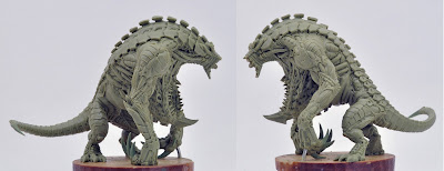 Next - the masses of the finished creature are put in place and detailing started. In the picture below, the sculpting is a quite advanced, and a lot of the smaller details are already in place. JAG works in a polymer clay (or a mix of different 'clays' I believe), so the whole sculpt is wet at this stage and won't be baked and hardened until most of the work in complete.